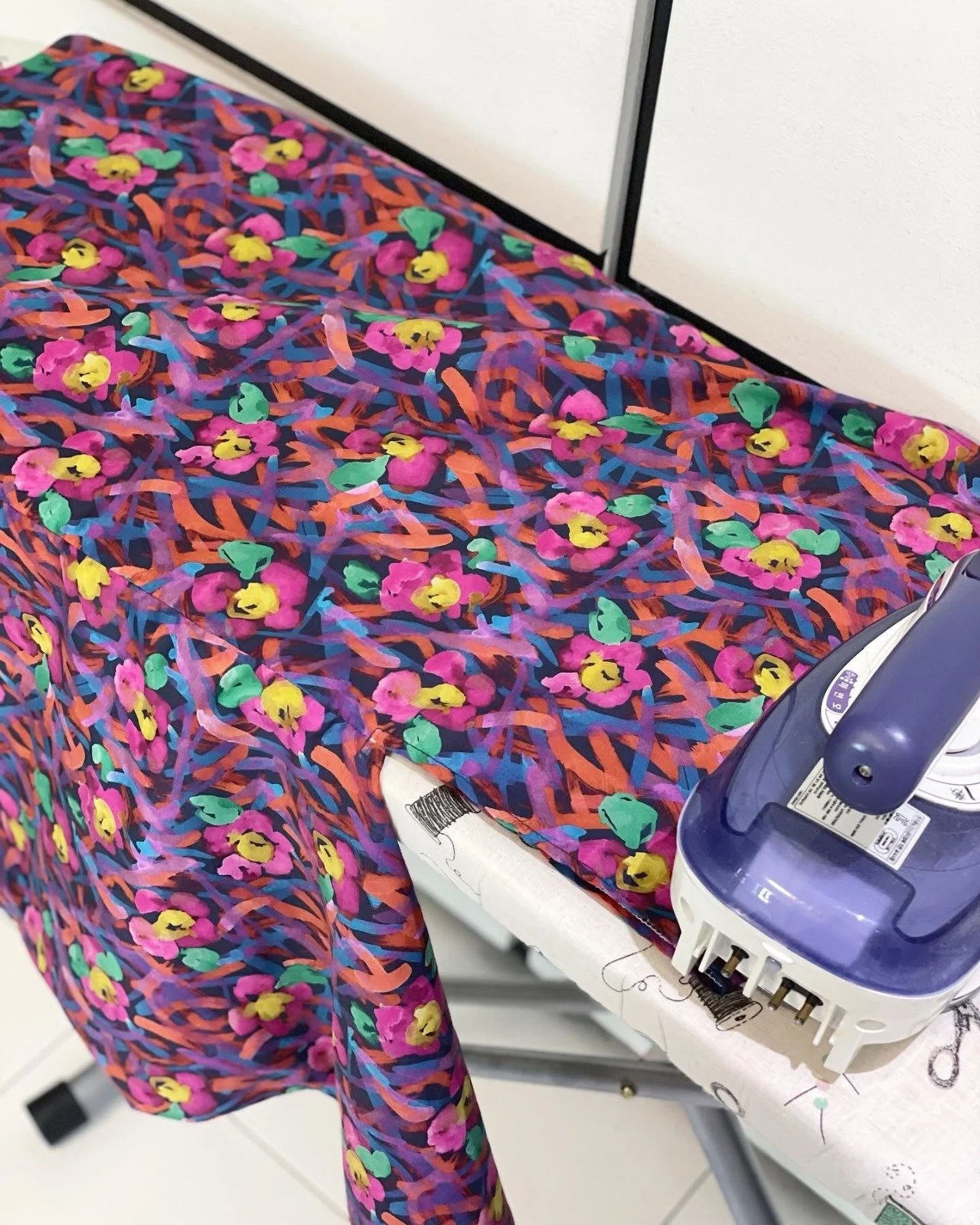 Jasmine was attracted to the Wandering print and I worked with Harvest Time. Over, the next two hours we cut fabrics, overlocked them, ironed and stitched up the two simple Tenugui Shikakui tops.